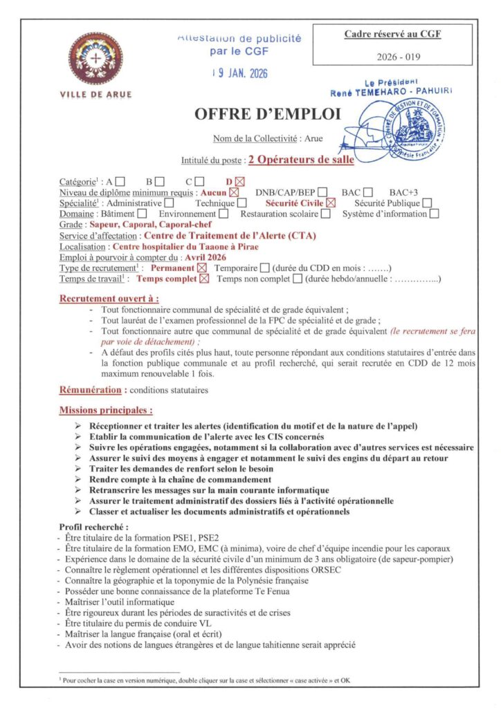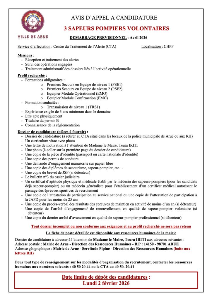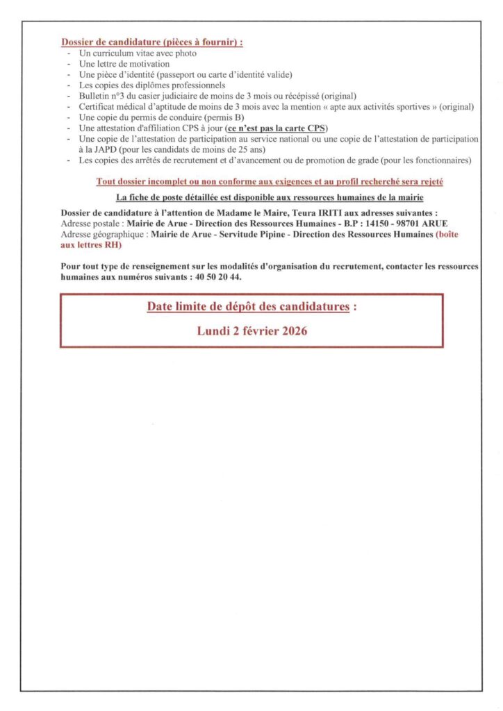La mairie de Arue informe que le délai pour déposer sa candidature pour les postes ci-dessous a été prolongé jusqu’au 6 février 2026.